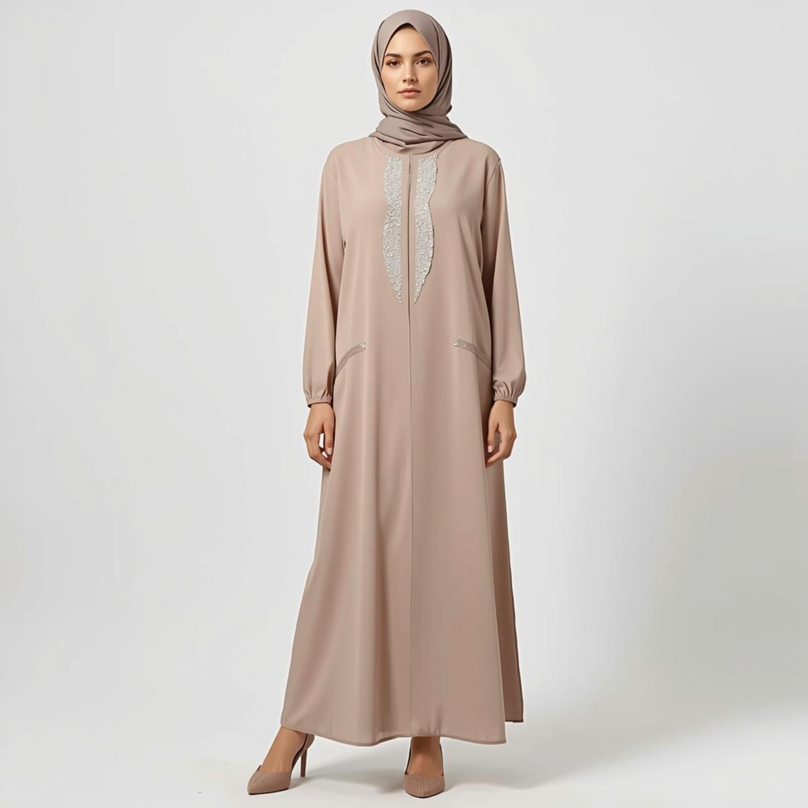 A stylish taupe abaya adorned with subtle silver embroidery along the front. The flowing silhouette and understated design offer both comfort and a touch of modern elegance for everyday or formal occasions.