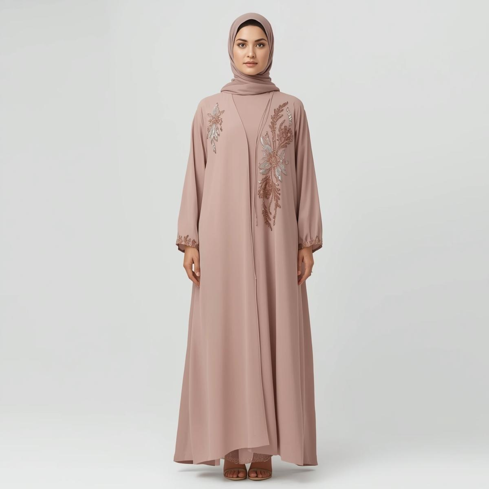 This mauve abaya is beautifully decorated with intricate floral embroidery on the chest and sleeves, blending modern design with classic charm for a graceful, feminine look.